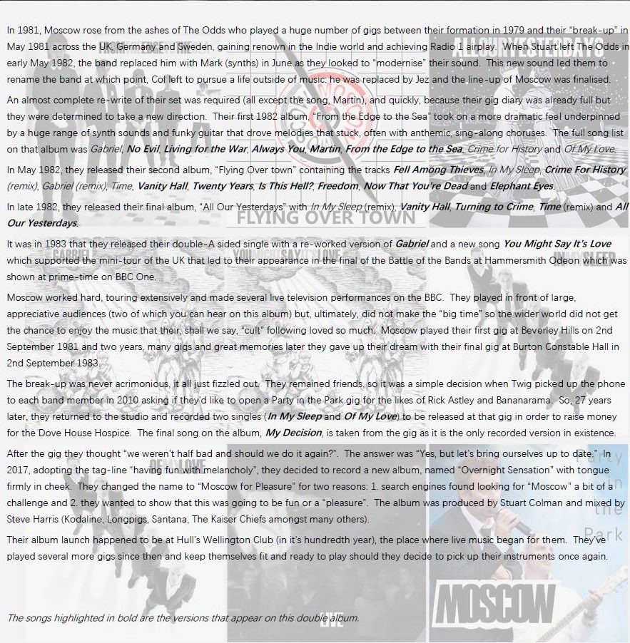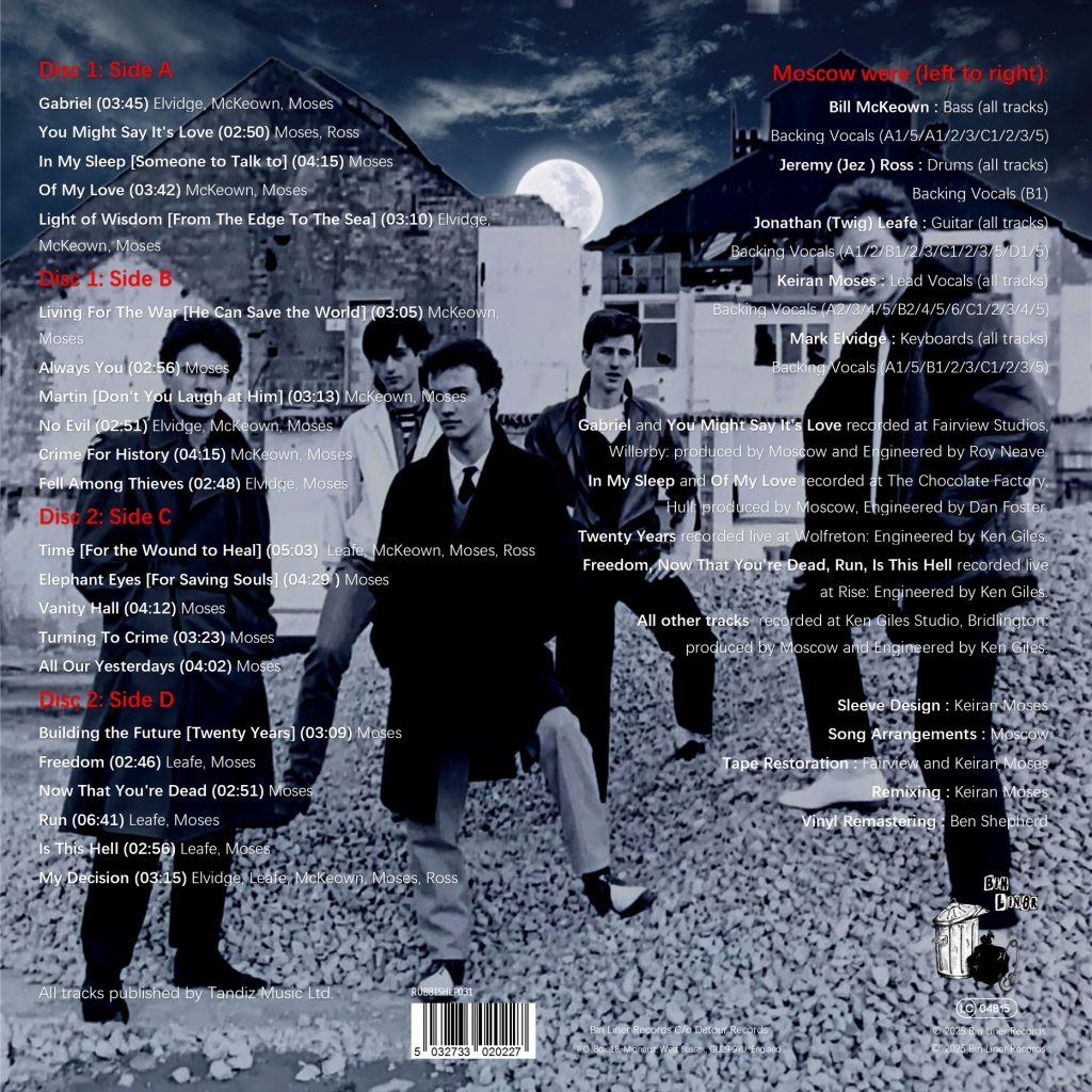 In 1983, their single Gabriel sparked a UK mini-tour that finished with a BBC One Battle of the Bands final at Hammersmith Odeon. Moscow toured hard, appeared on BBC television and played to enthusiastic crowds, two of which are featured on this album. Although they never reached mainstream breakthrough, they built a devoted cult following that cherished their music.